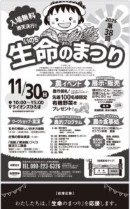 11月30日には、木市でおなじみのライオンズ広場にて、毎年恒例の有機農業収穫祭「いのちのまつり」を開催します。短い秋の実りを楽しむ催しです。ぜひご一緒に楽しみましょう。